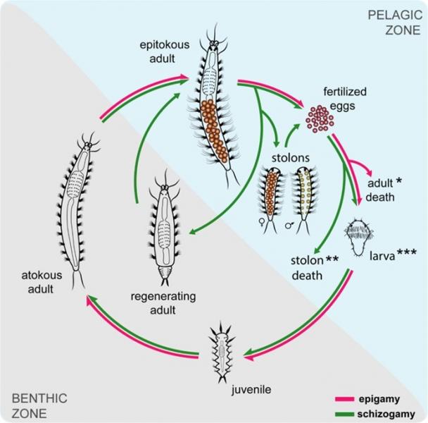 Representación esquemática del ciclo de vida de Syllis prolifera (flechas verdes) y Nudisyllis pulligera (flechas rosas) / UAM