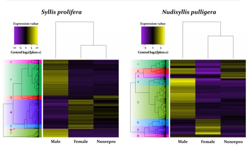 Así, empleando esta técnica para estudiar hembras, machos e individuos sexualmente inmaduros de dos especies distintas, los investigadores lograron identificar un total de 762 genes que se expresaban de manera diferente en estas tres condiciones en la primera especie (Syllis prolifera), y un total de 1.214 en la segunda especie (Nudisyllis pulligera).