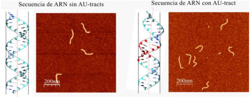 Alberto Marín, investigador del CNB-CSIC y primer autor del trabajo explica: “realizando comparaciones computacionales de una variedad de moléculas de ARN con distintas secuencias hemos observado que aquellas que contenían regiones concretas con bases de adenina y uracilo seguidos (AU-tracts) se curvaban, a diferencia de las moléculas que no incorporaban estas secuencias. Fue un resultado totalmente inesperado”. Para confirmar estos resultados, los investigadores han diseñado moléculas de ARN con secuencias AU-tracts y analizado su disposición utilizando un microscopio de fuerzas atómicas (AFM). “De esta forma, hemos comprobado que las secuencias AU-tracts en las moléculas individuales de ARN de doble hebra modulan la curvatura del ARN”, detalla Fernando Moreno-Herrero, uno de los investigadores que han liderado el trabajo.