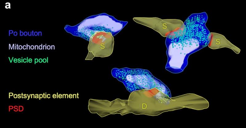 Empleando técnicas avanzadas de microscopia electrónica tridimensional y marcado de axones individuales, los investigadores lograron medir y comparar estructuras de sinapsis formadas por ramas del mismo axón talámico en dos áreas cerebrales distantes.