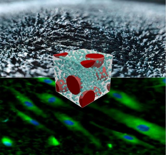 La imagen muestra las fuerzas generadas por un campo magnético externo sobre las partículas incrustadas en el material. Estas interacciones son simuladas por un modelo computacional que es capaz de guiar el proceso de fabricación y experimentación (imagen intermedia). Por último, las fuerzas generadas son transmitidas a las células cultivadas sobre el material inteligente (imagen inferior). Dicha actuación sobre las células dará lugar a cambios o activación de sus funciones biológicas, como su proliferación, migración u orientación, entre otras.