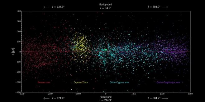 El mapa es tan detallado que ha permitido al equipo científico descubrir algo que nadie había visto hasta ahora: un ramal de nuestro brazo espiral (el de Orión) de unos 10.000 años-luz de longitud que se extiende hacia afuera en dirección al siguiente brazo (el de Perseo), elevándose además por encima del plano de la Galaxia. Los investigadores han bautizado a esa nueva estructura descubierta “el espolón de Cefeo”: espolón (spur en inglés) porque es como se denominan este tipo de estructuras entre brazos y de Cefeo porque es la constelación donde es más prominente.