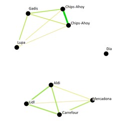 Similitudes entre las distintas marcas de galletas / Una conexión más gruesa y de color más verde indica una mayor similitud